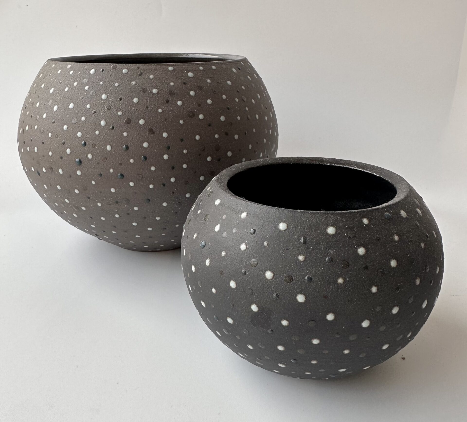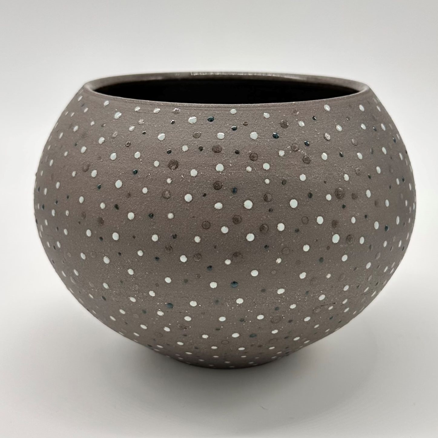 Gris anthracite mat à l’extérieur, couleur de la terre brute non émaillée et ponctuée de points de différentes nuances de couleurs