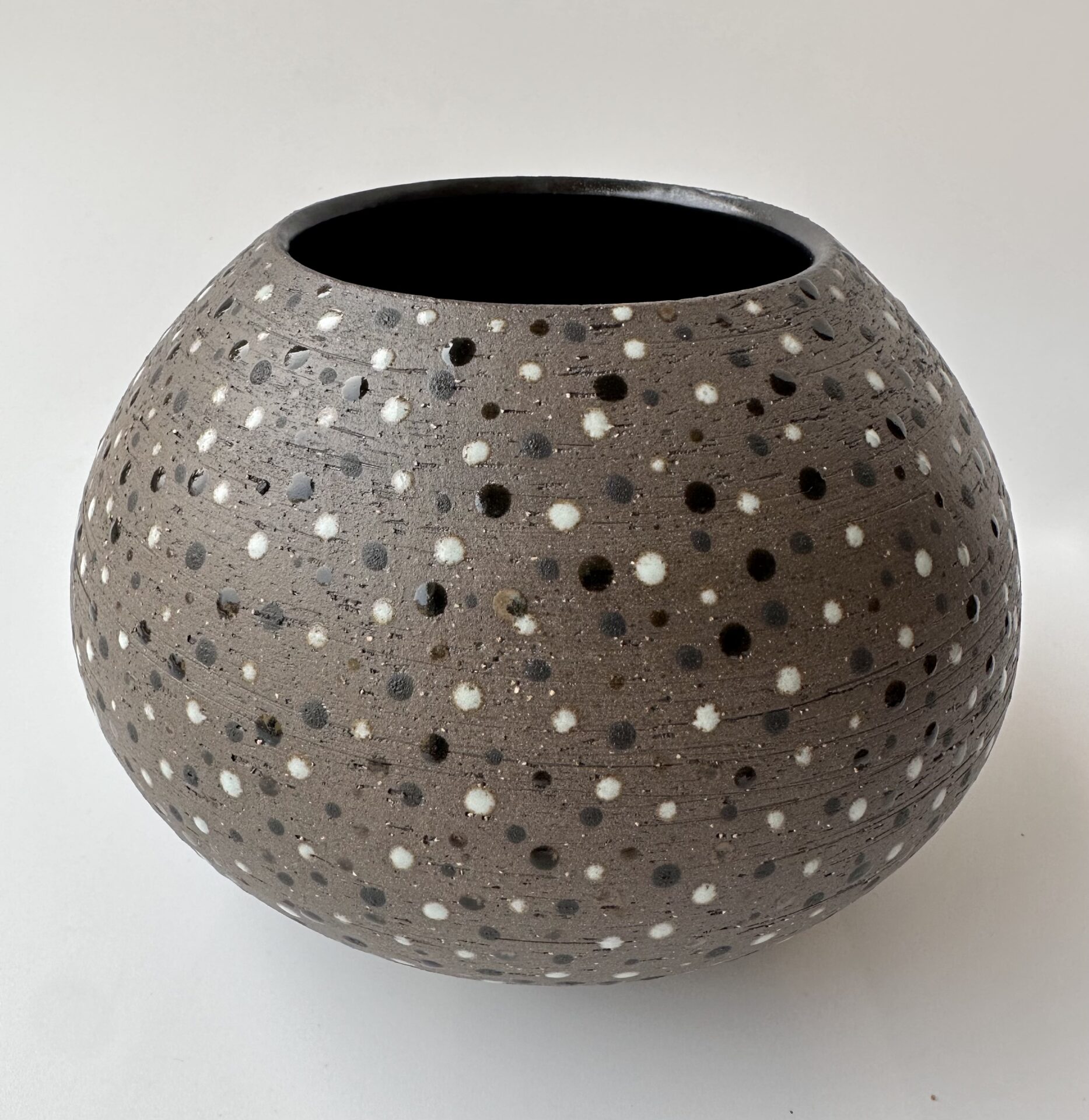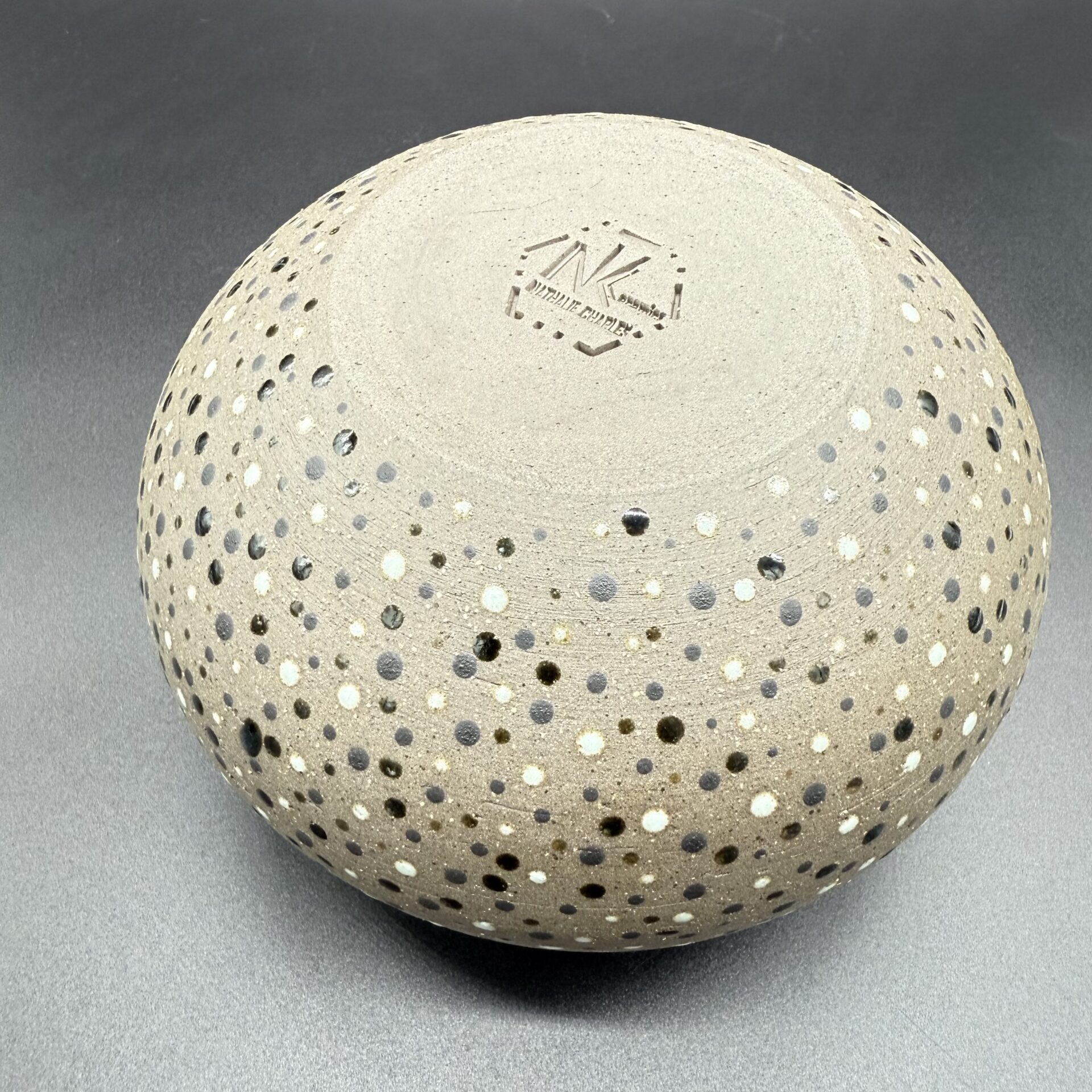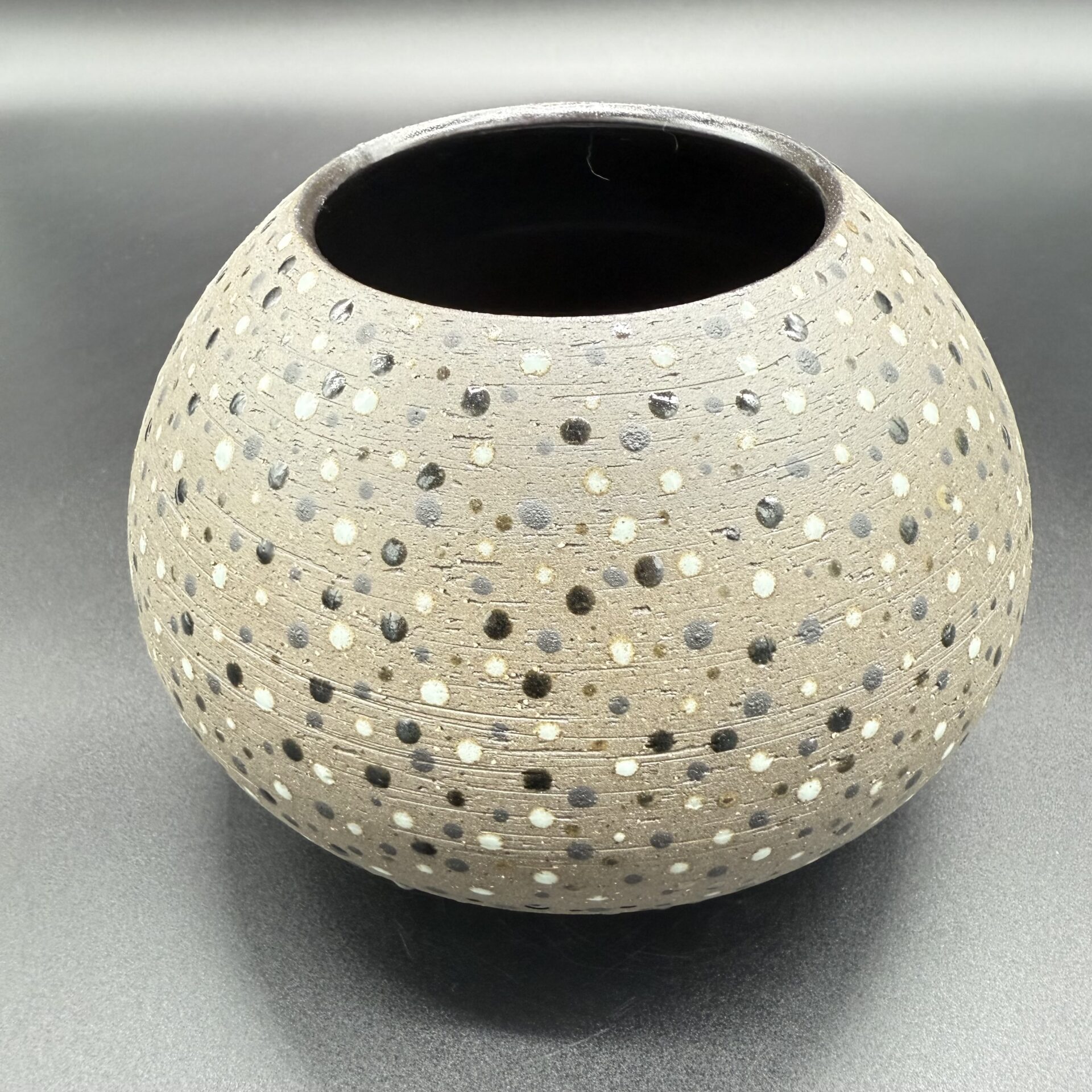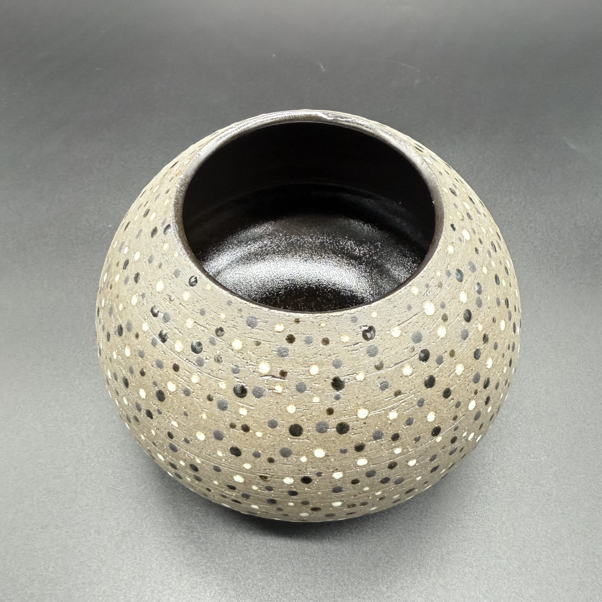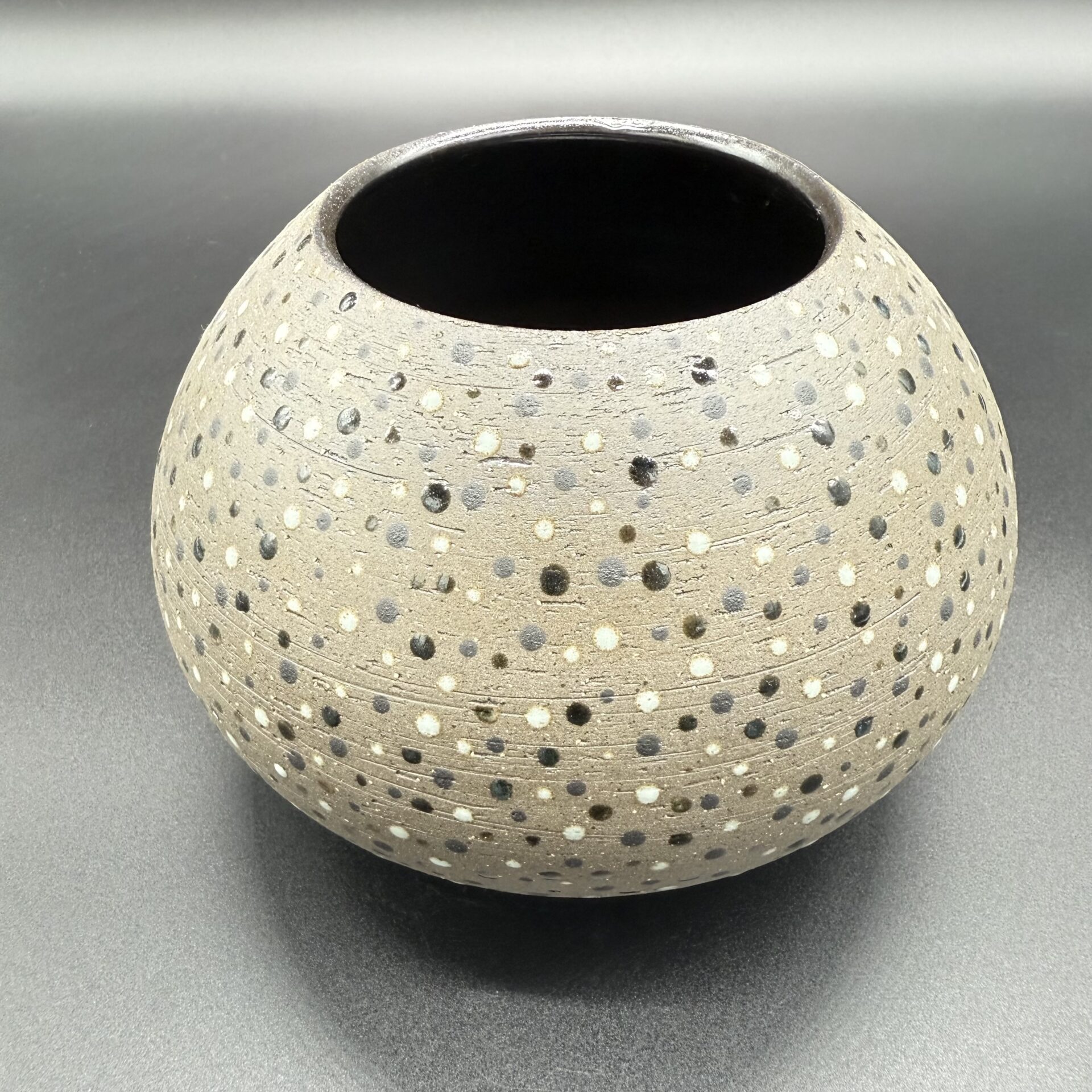 Gris foncé à l’extérieur, couleur de la terre brute non émaillée et ponctuée de points de différentes nuances de couleurs