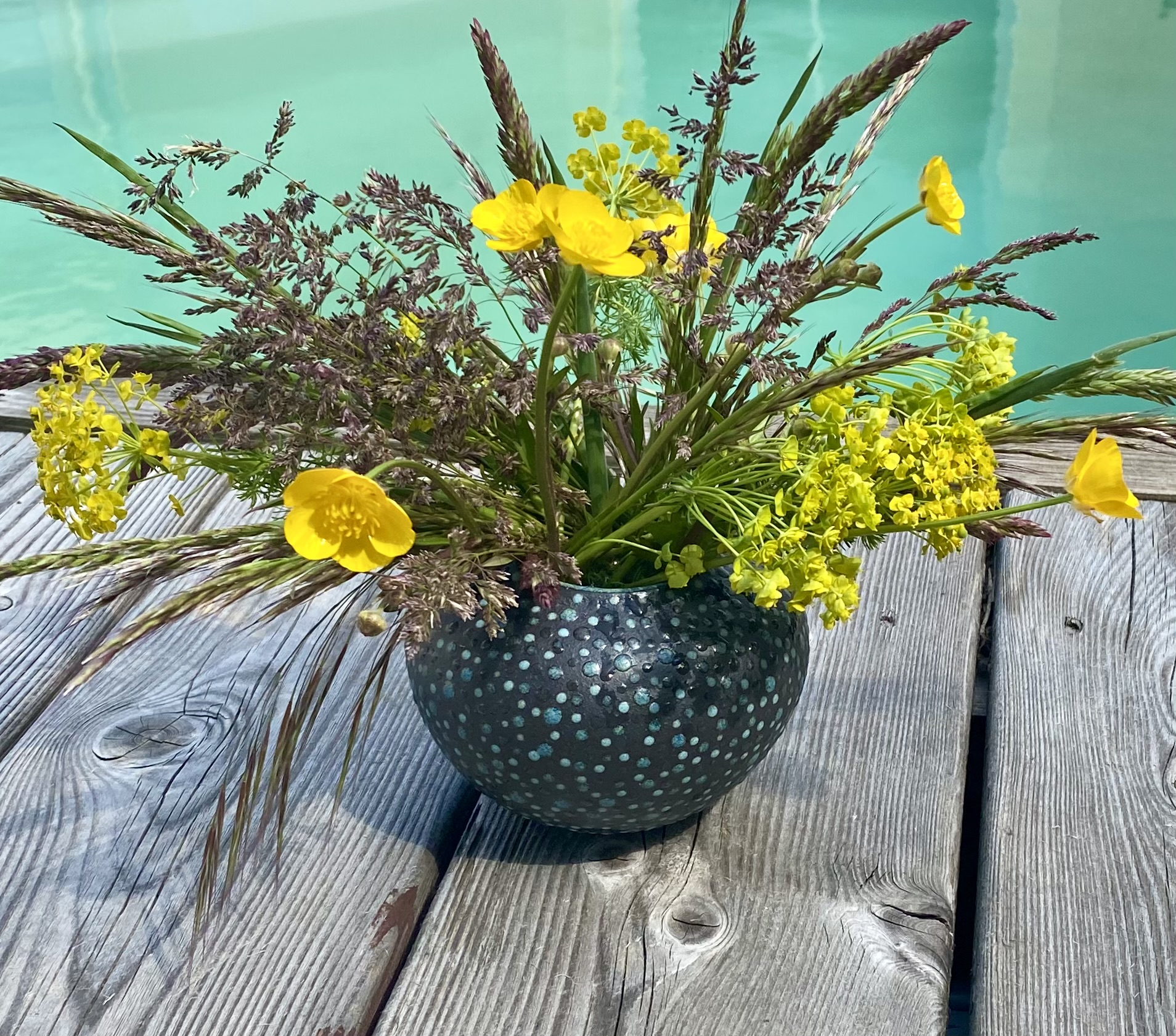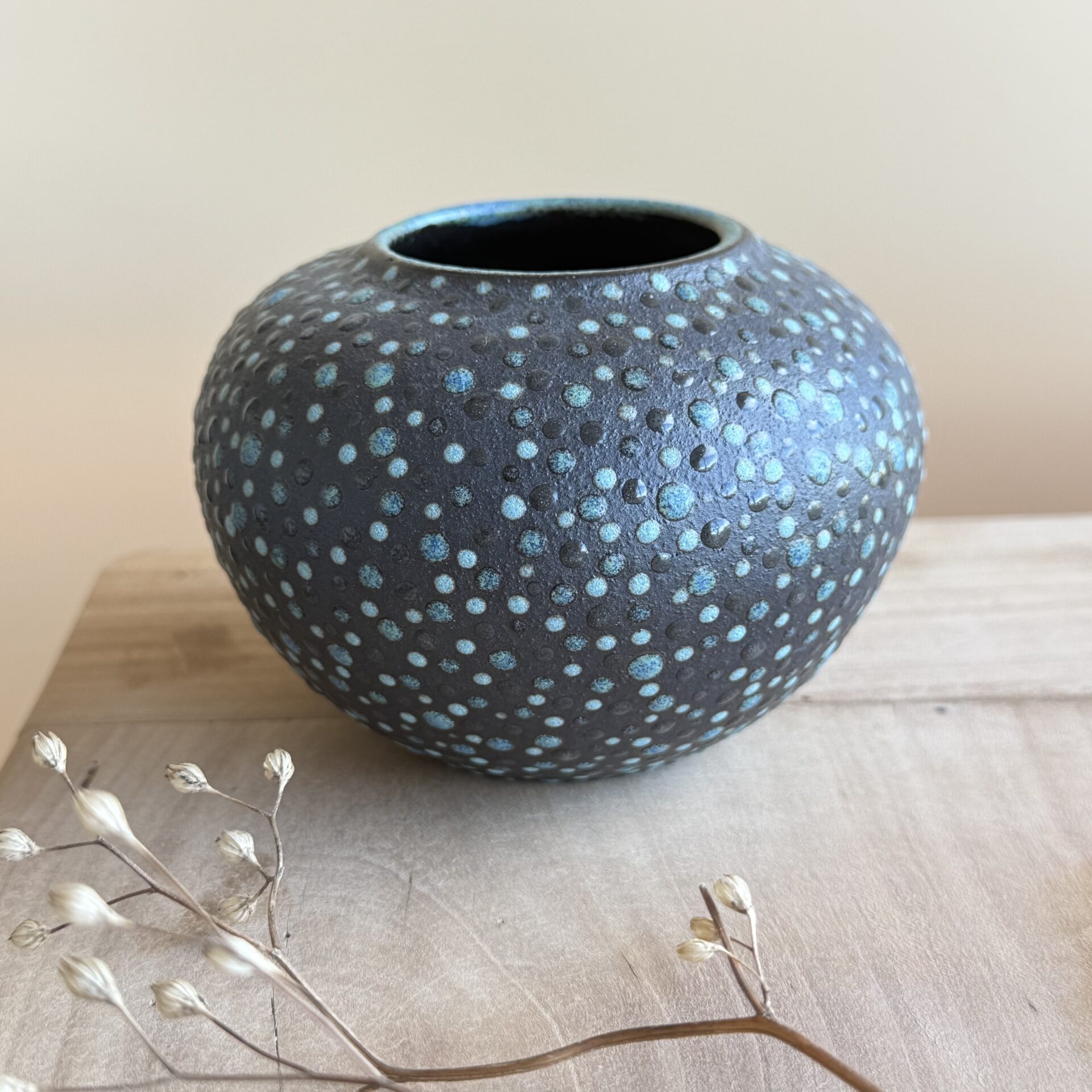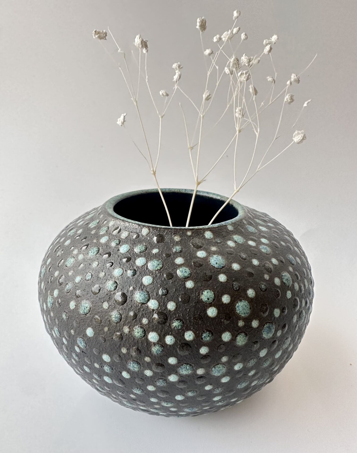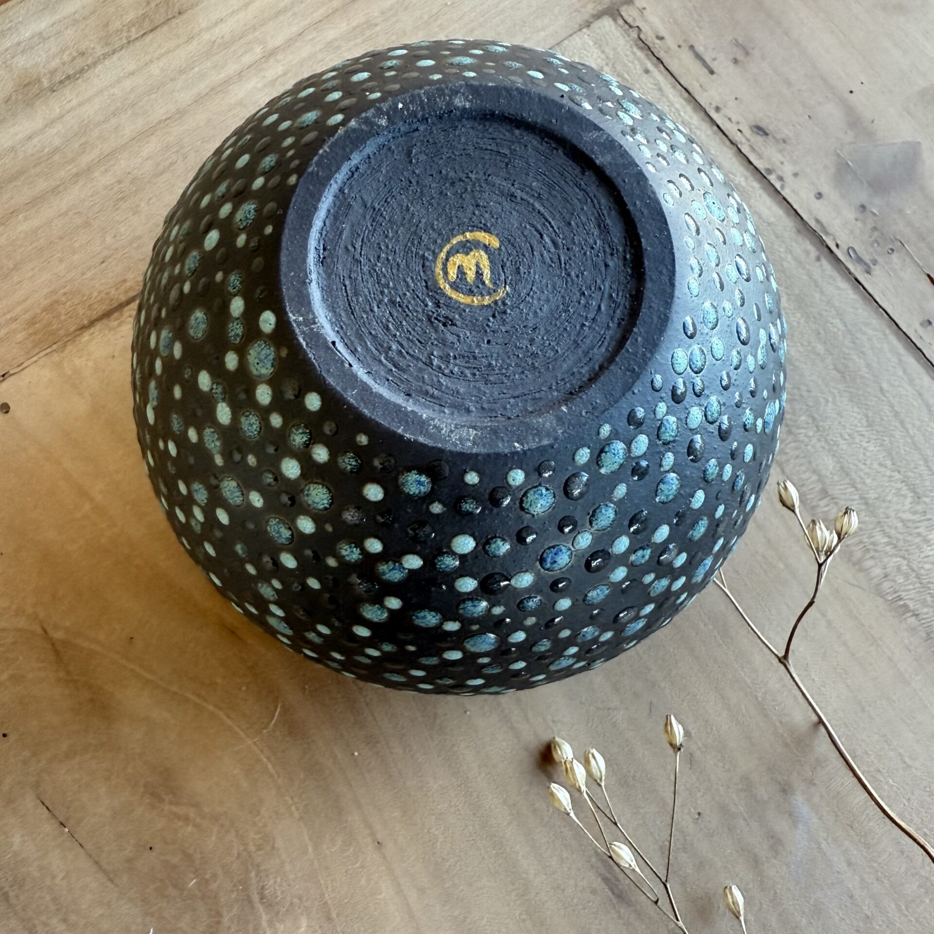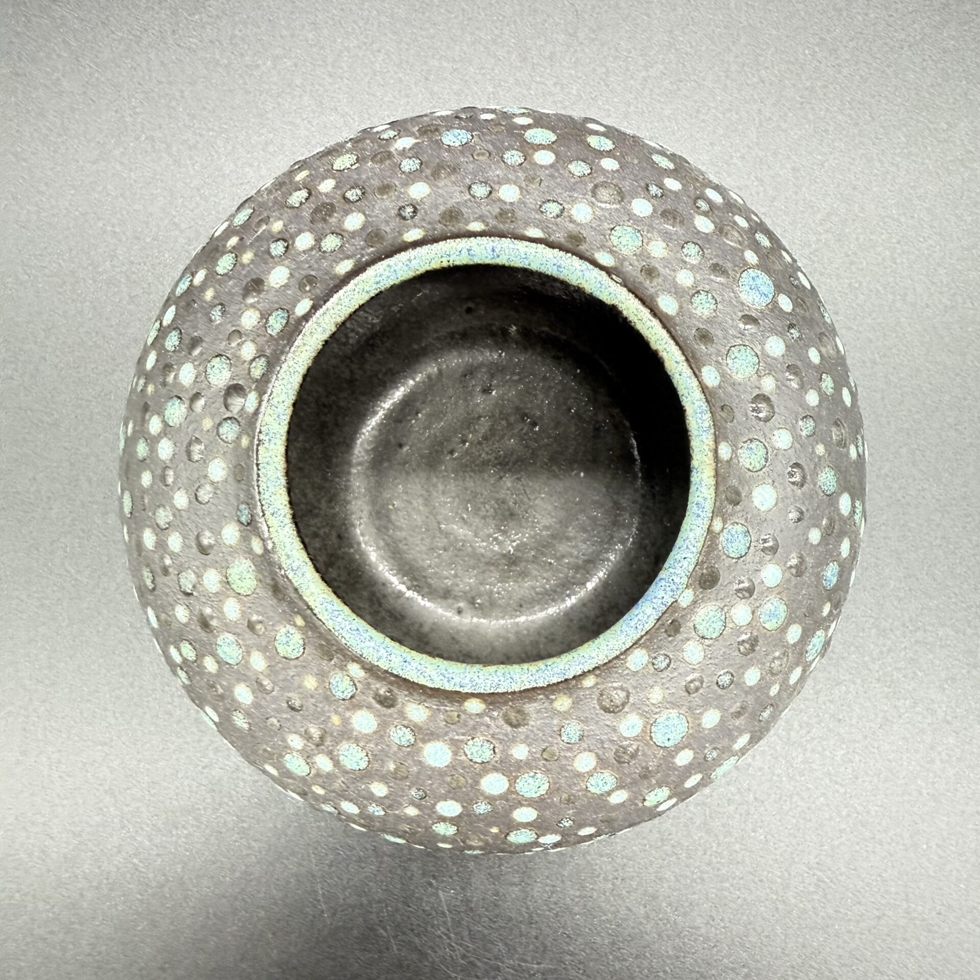 Email brillant à l’intérieur; terre noire laissée brute à l’extérieur et ponctuée de points dans les tons turquoise