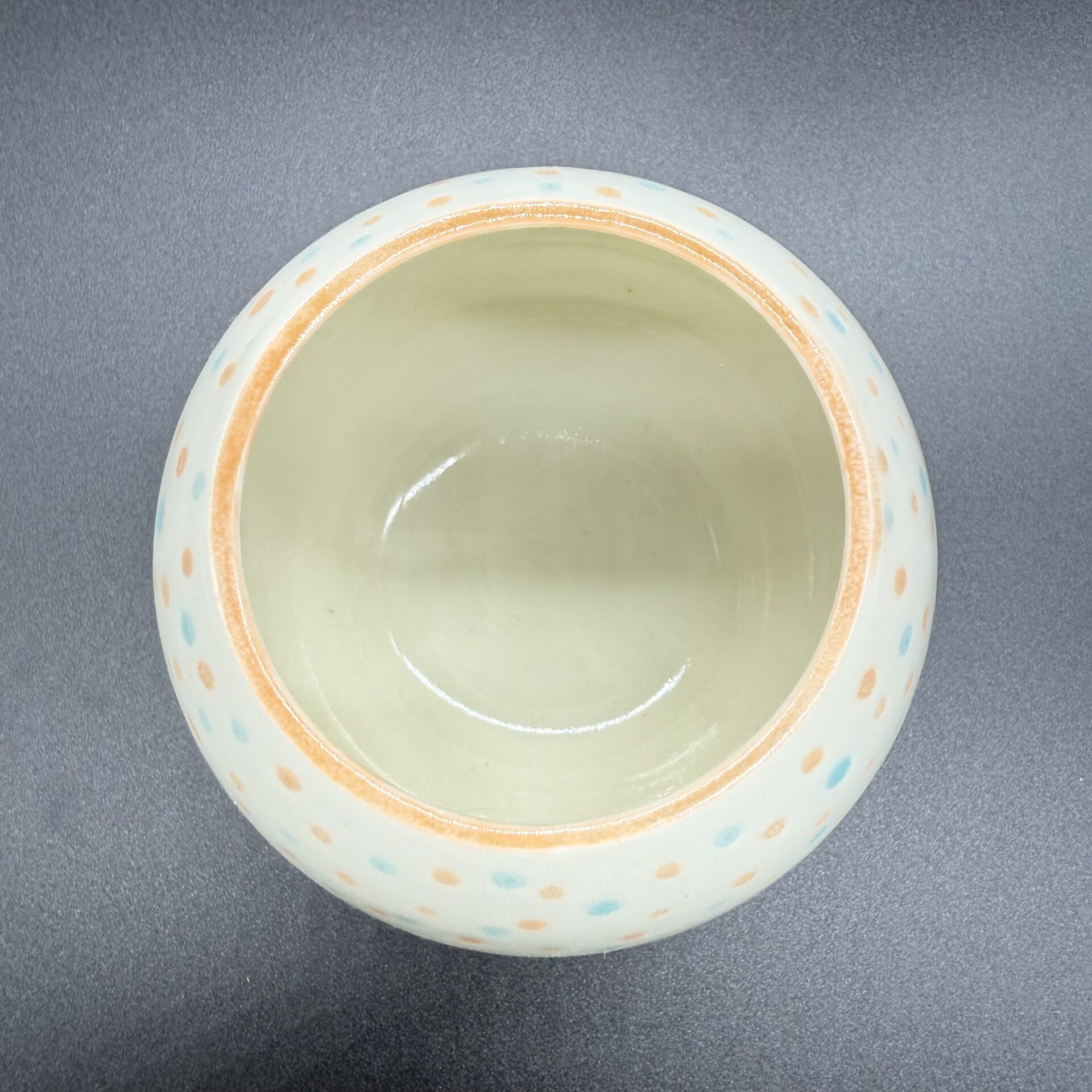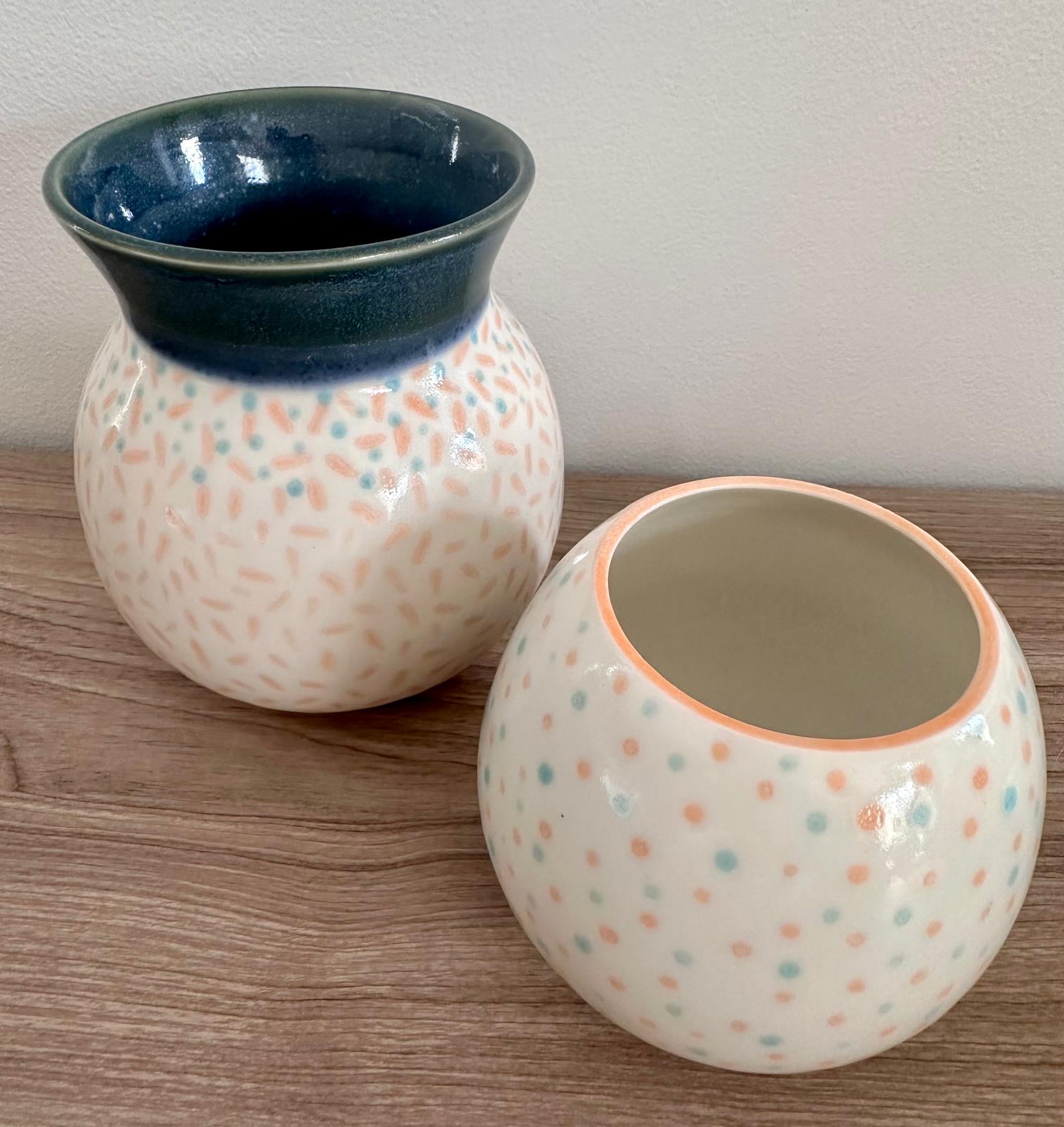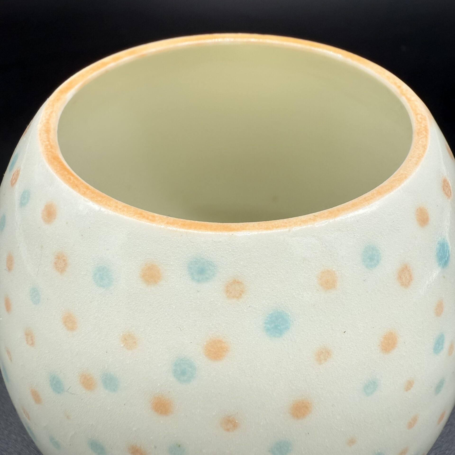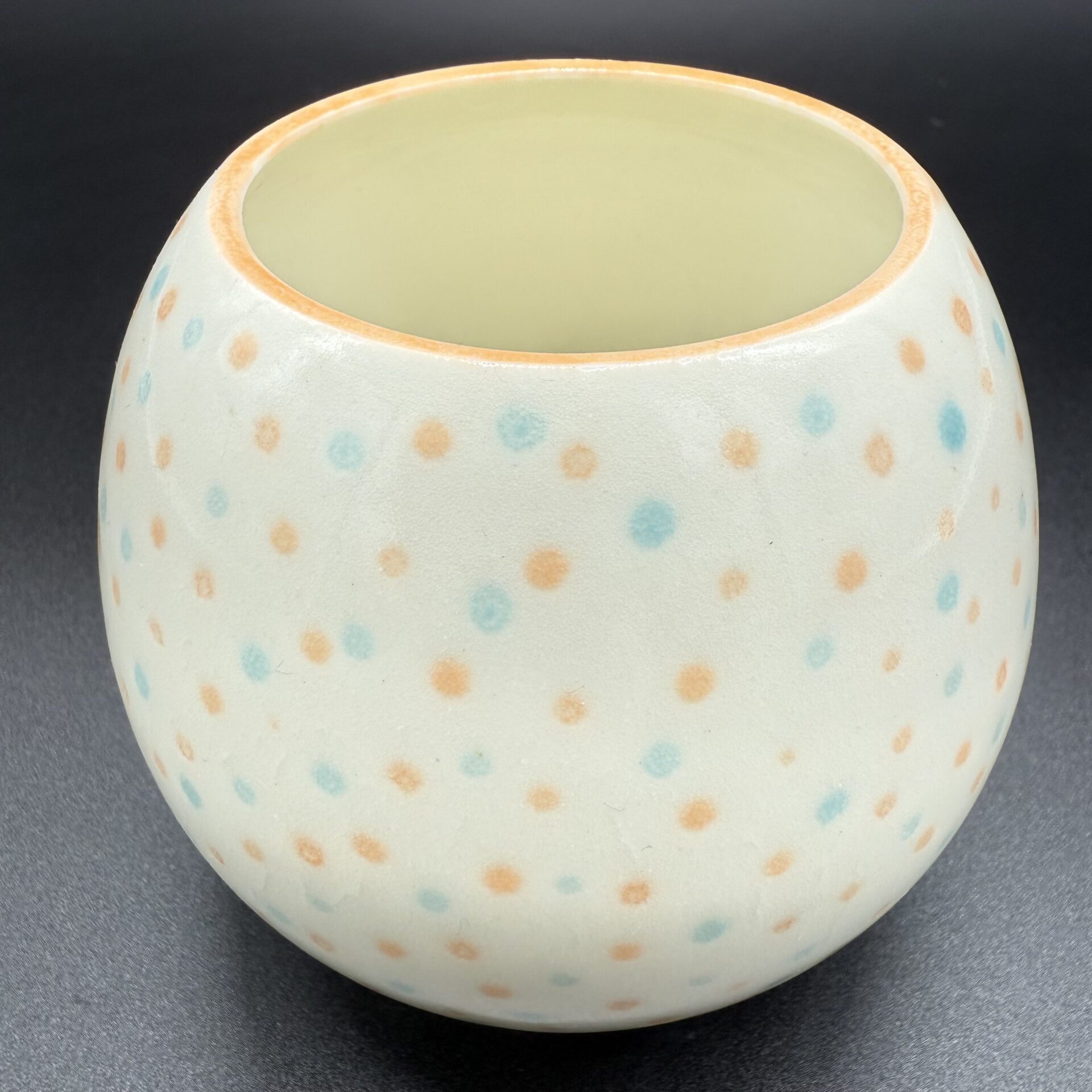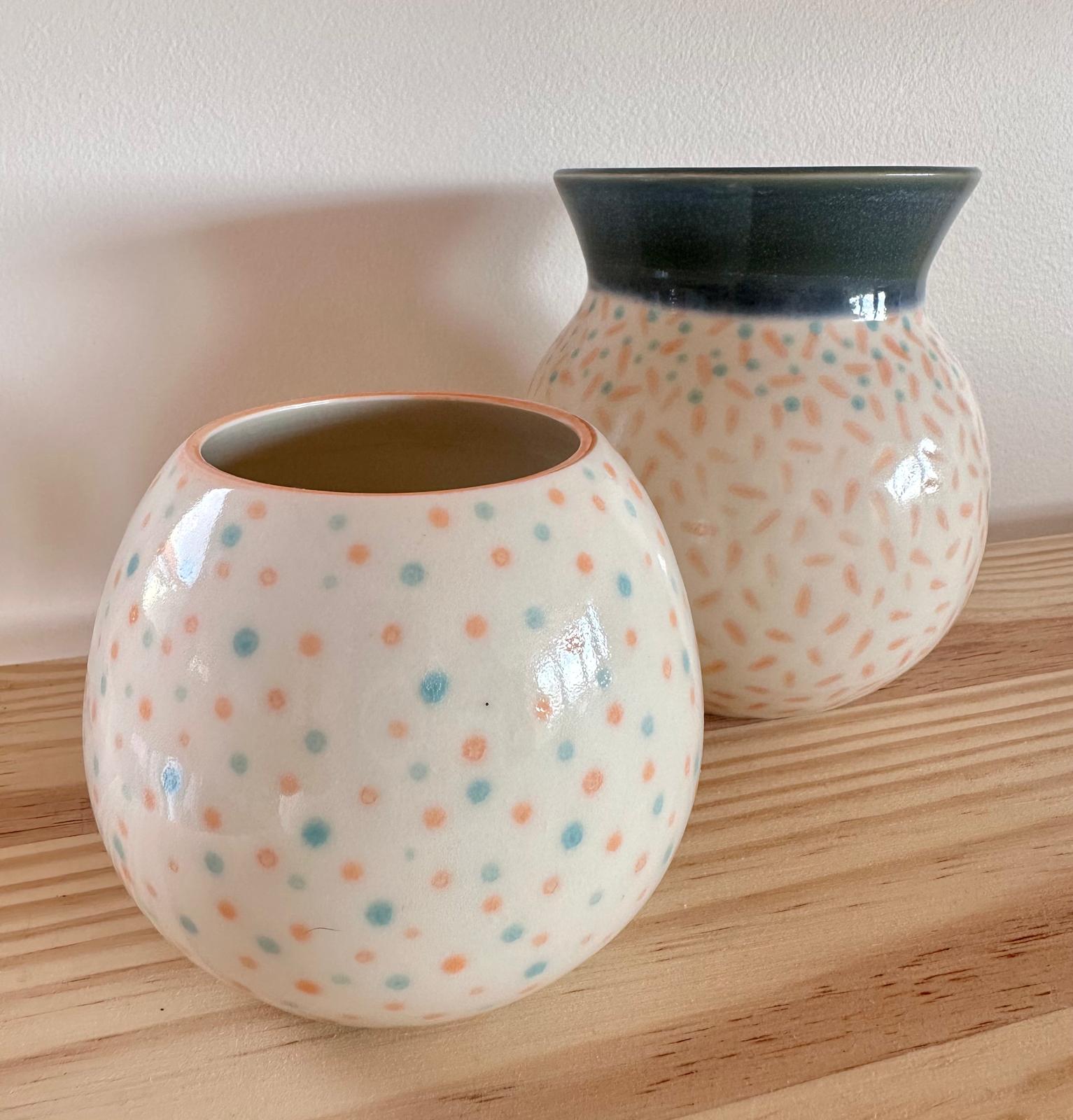Fait main En porcelaine blanche Email transparent laissant visible la blancheur de la porcelaine, ponctué de points Orange et Bleu